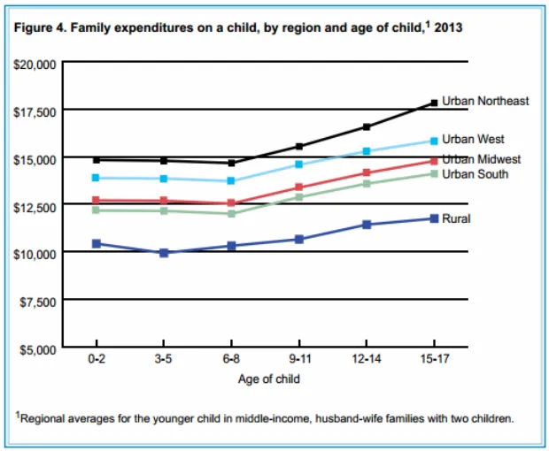 拉法达的经历与联邦数据一致。美国农业部估计,在拉法达居住的城市南部,抚养一个孩子的成本为230,600美元。在全国平均城市地区(包括郊区卧室社区),成本甚至更高:253,700美元。这比在农村地区抚养一个孩子的费用高出整整24%,约为193,600美元。下面的图表来自美国农业部最新的儿童支出 报告,显示在美国的城市地区抚养一个孩子的年度成本显著更高,并且随着孩子年龄的增长,费用只会增加。