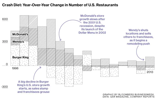 插图:贾斯廷·梅茨在其历史的大部分时间里,美国的快餐行业以快速和可靠的增长为特征。从创始人雷·克罗克在1955年在伊利诺伊州德斯普兰斯开设的第一家餐厅开始,麦当劳在10年内成为美国700多家门店的连锁店。到1983年,门店数量达到了6000家,在接下来的二十年里,公司平均每年在美国开设约360家门店。较小的竞争对手 汉堡王全球公司 和 温迪 也有着令人印象深刻的早期增长故事。