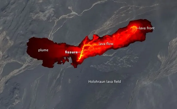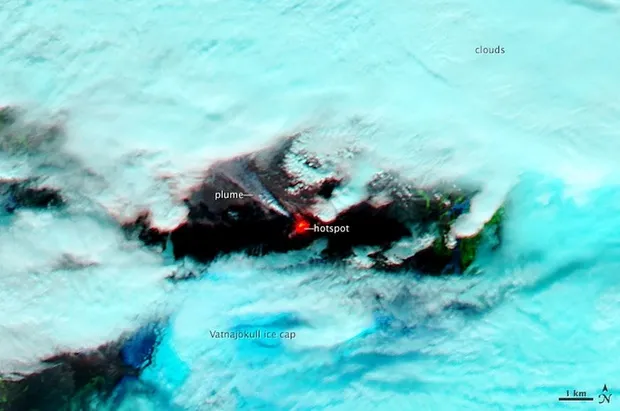 虽然巴达尔邦加火山和熔岩正在“轰鸣”,但由于技术限制和云层覆盖,获取该事件的良好空中影像一直很困难。然而,在过去几天中,NASA的卫星成功捕捉到了火山冒泡源头的图像。首先,这是周日拍摄的假色彩图像,显示了一个强烈的热源和烟雾柱(该图像同时使用了红外线和可见光):