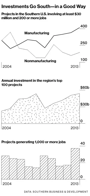 2014年4月,波士顿咨询集团的一项研究发现,美国在前10个出口国中仅次于中国,排名第二。三年前,BCG的董事总经理哈罗德·西尔金(Harold Sirkin)作为报告的共同作者,预测南卡罗来纳州、阿拉巴马州和田纳西州等州将成为“工业化世界中最便宜的生产地点之一”。对于那些在美国销售产品的公司来说,这一点尤其真实。南方“已经成为在世界最大经济体内部制造产品的最便宜地方,”SB&D的出版商迈克尔·兰德尔(Michael Randle)表示。