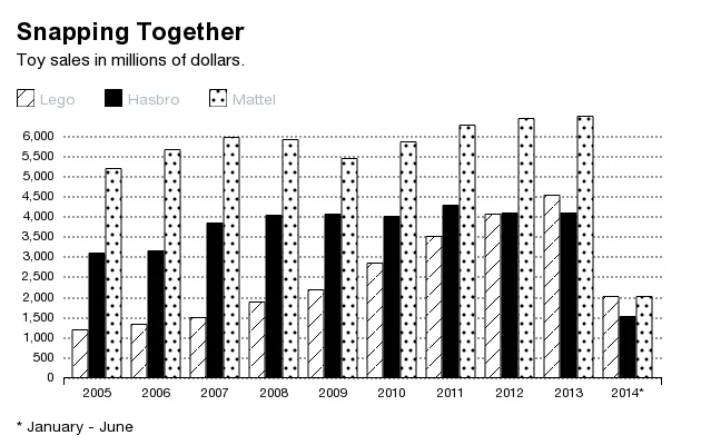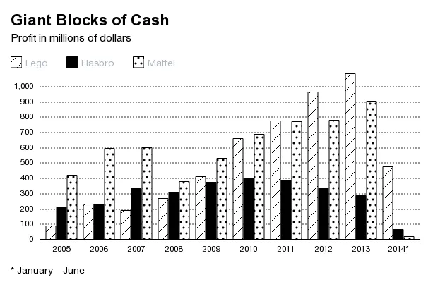 乐高夺得销售桂冠无疑是个大事件,但该公司在三年前就已经在利润上超越了美国竞争对手。凭借基本上只有一款产品和遍布全球的新制造设施,乐高建立了玩具行业——甚至任何行业中最稳固的企业模型之一。在过去四年中,其利润率每年都超过20%,在2014年上半年几乎达到了24%。
