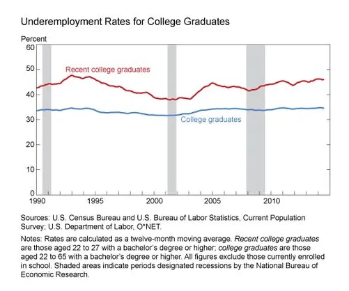 **2. 大学生没有获得学位所需的工作。**根据数据,近一半的最近大学毕业生从事的职位不需要大学学位。纽约联邦储备银行通过分析有多少毕业生的工作在政府调查中被一半同事认为不需要由拥有学士学位的人来填补,从而计算出这个比例。(乔治城大学教育与劳动力中心的安东尼·卡内瓦尔告诉华尔街日报这个定义太狭隘。)