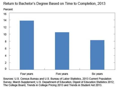 贾森·R·阿贝尔和理查德·迪茨 **3. 不要继续上学。**至少不要超过四年。研究人员计算说,花额外的一年完成大学学业将使学生比按时毕业并在学校后开始工作时少85,000美元。花6年时间在大学的总费用为174,000美元。成为超级大四就像对你的银行账户挥动斧头:花费额外两年在学校的人比按典型速度前进的同龄人损失了40%的投资回报。