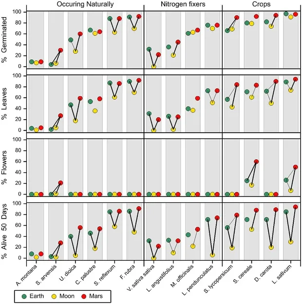发芽率、叶片形成、花朵形成和植物在50天后仍然存活的比例,按物种分类。PLoS One火星土壤的表现优于其他任何土壤,这让研究人员感到惊讶。他们写道,结果表明在这些模拟土壤中种植作物在理论上是可能的,也许在人工围 enclosure 中的真实火星土壤中也是如此。“然而,”他们补充道,“关于模拟土壤的持水能力仍然存在许多问题……以及这些模拟土壤是否代表真实土壤。”更不用说火星特有的重力和光照的影响。