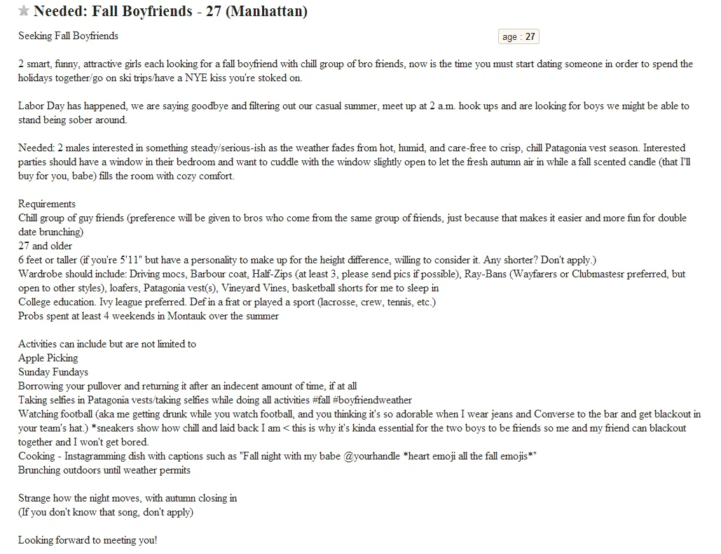 今年,两位女性拒绝在酒吧或约会应用上冒险,公开寻求最精英的“秋季男朋友”,在一则Craigslist帖子中,该帖子出现在个人广告的“抱怨与赞美”部分。