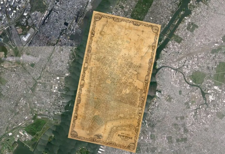 一张1852年的纽约地图与谷歌地球对比。大卫·拉姆齐历史地图收藏自动定向几乎同样常见,并且随着伦敦和纽约等城市开始在街角放置为行人旋转的地图而变得越来越普遍。游客不再需要扭头,或将他们的指南书倒过来。