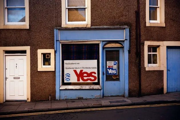 在苏格兰塞尔基克的一家商店里展示了一张支持独立的竞选海报。摄影:西蒙·道森/彭博社民调显示,苏格兰的独立运动可能在9月18日的公投中获胜。英国的博彩公司对此并不看好。