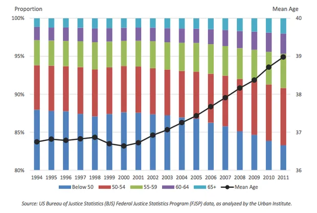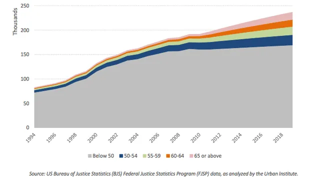 在1994年,50岁以上的囚犯仅占美国联邦监狱总人口的12%。在这段时间里,监狱中老年人的数量增加了330%。正如报告所指出的,这是联邦监狱人口中增长最快的年龄组。