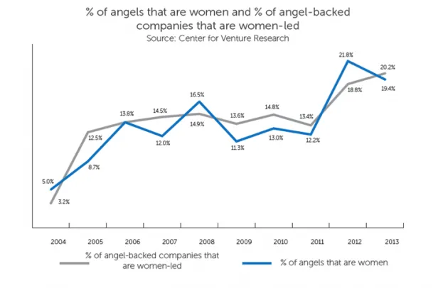 女性在2013年占寻求天使资本的所有企业家中的23%,而在2005年仅为9%。2005年,女性天使投资者不足20,000人,但到去年这一数字增加到近58,000人。