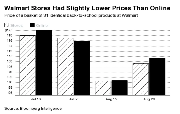 注意沃尔玛购物者:商店里的价格可能比Walmart.com稍微低一些。 彭博情报的分析师比较了沃尔玛商店和Walmart.com上的31种相同的文具——蜡笔、记号笔、钢笔等——并在四次调查中发现商店里的价格在三次中更便宜。