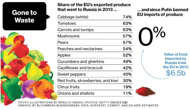 彭博社商业周刊疾病控制与预防中心不会向公众提供生育治疗风险的全面信息绿色投资者在特朗普的总统任期中发现了一线希望忘掉工厂吧,美国小镇想要Buc-ee’s加油站埃隆·马斯克的首次高峰(和低谷)几个月前,许多经济学家认为,乌克兰冲突对欧洲经济的主要冲击将是天然气价格上涨;现在的罪魁祸首是便宜而丰富的食品。根据总部位于布鲁塞尔的Copa-Cogeca(欧洲最大的农民工会之一)的说法,俄罗斯的禁令降低了芬兰乳制品、西班牙桃子、拉脱维亚卷心菜和其他农产品的价格。它也影响了牛肉、猪肉和鸡肉的价格,这些产品同样被禁。去年,俄罗斯约占欧盟牛肉出口的四分之一,几乎占其水果和蔬菜出口的三分之一。农产品特别脆弱,因为它比奶酪更易腐烂,奶酪可以储存直到价格上涨。禁令生效后,荷兰黄瓜和番茄的价格下降了80%,Copa-Cogeca表示。捷克共和国的苹果价格比去年下降了70%,而西班牙、意大利和希腊的农民则获得的桃子和油桃价格下降了30%至50%。