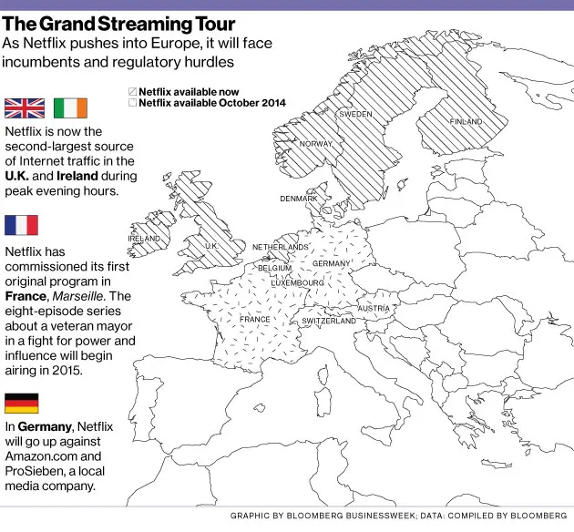 Netflix于2010年进入加拿大,此后将其流媒体服务扩展到拉丁美洲和斯堪的纳维亚、英国和荷兰。现在它正在增加法国、德国、奥地利、瑞士、比利时和卢森堡。根据联合国机构国际电信联盟的数据,到2013年底,Netflix所在的欧洲国家拥有超过1亿个宽带账户,而美国则为9100万个。