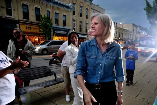 威斯康星州民主党州长候选人玛丽·伯克于8月1日在拉辛县民主党总部露面,与选民和当地竞选工作人员见面照片由斯科特·安德森/《日报时报》通过美联社照片提供玛丽·伯克,这位竞选威斯康星州州长的民主党人,尽管民调显示她对共和党现任州长斯科特·沃克(可能的2016年总统候选人)有微弱领先,但她并没有得到应有的全国关注。如果伯克在11月获胜,沃克获得共和党提名的机会可能就会化为泡影。