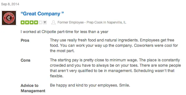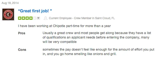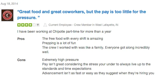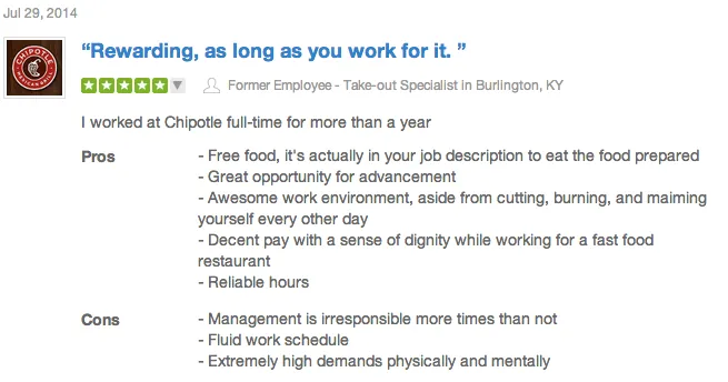 来自Chipotle员工在Glassdoor.com上的其他评价提到,工作环境要求高且节奏快,尽管他们仍然提到“优秀的团队”和“晋升机会”等使其成为一个值得工作的地方