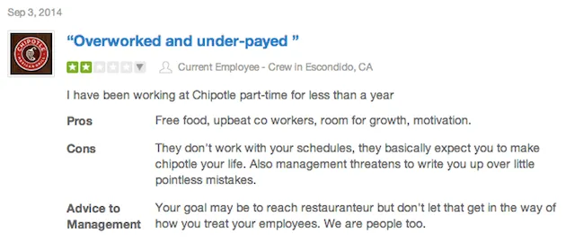 根据外部指标,例如工作网站 Glassdoor.com,该网站收集员工的匿名信息,Chipotle 的评分为 3.4 分(满分 5 分),略高于其餐饮服务同行(平均 3.2 分)。在 Glassdoor 上,Chipotle 的员工最常赞扬免费的食物,同时批评低工资和快节奏的环境。这种紧张的节奏与一位在暂时关闭的宾州州立大学地点的前经理的投诉相呼应,他告诉博客 Onwardstate.com,工作时常常是 10 小时或 12 小时没有吃饭的休息。
