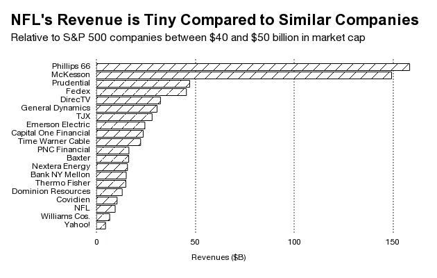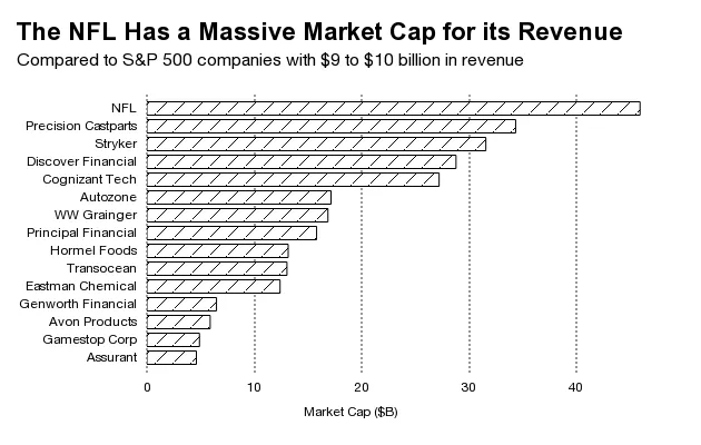 然而,与19家市值最相似的公司(从400亿美元到500亿美元)相比,NFL的收入基础是最小的之一。在收入方面,它将排在17家公司之后。