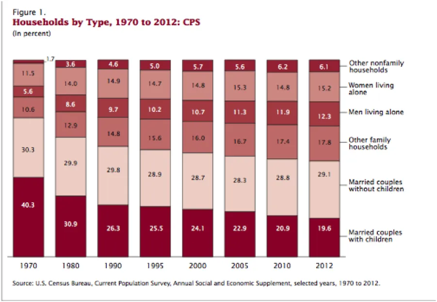 根据 美国人口普查局的数据,单人家庭的比例已从17%增加到27.5%。大多数独居人数的增加来自男性。在1970年代,单身男性相当罕见,仅占家庭的约5%。现在这样的家庭占超过12%。尽管单身家庭的增加没有整体未婚人数的增加那么显著,但它可能对经济产生深远的影响。