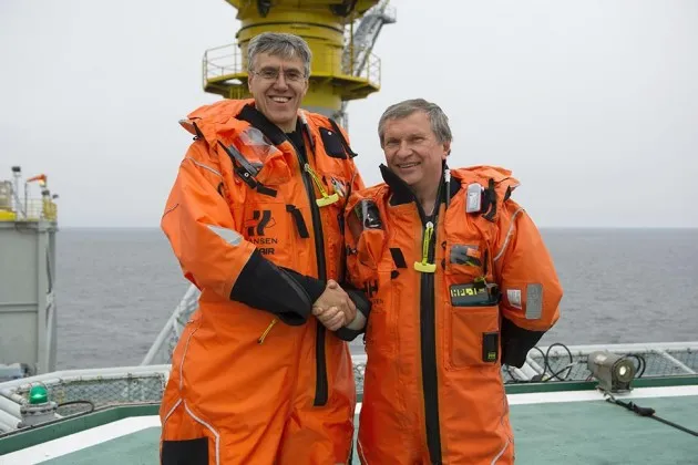 尼尔·达芬(左),埃克森美孚开发公司总裁,和伊戈尔·谢钦,俄罗斯石油公司总裁,2013年7月在一个海上钻井平台上照片由伊塔尔-塔斯社/祖玛新闻提供来自 彭博新闻 和 华尔街日报 的报道显示,美国将通过针对在北极有联合项目的石油公司宣布进一步制裁俄罗斯。这对 埃克森美孚 来说尤其麻烦,因为它与俄罗斯石油巨头 俄罗斯石油 有一个 $5000亿的合资企业,在 北极 开采极端石油。