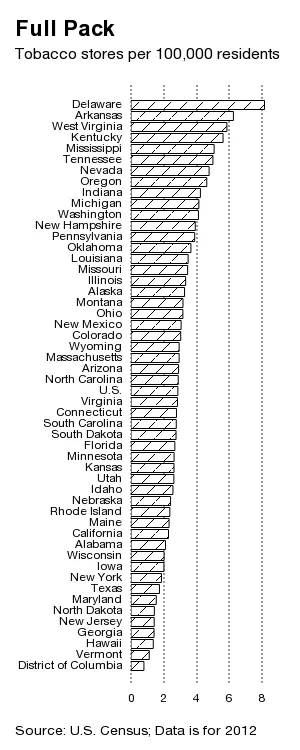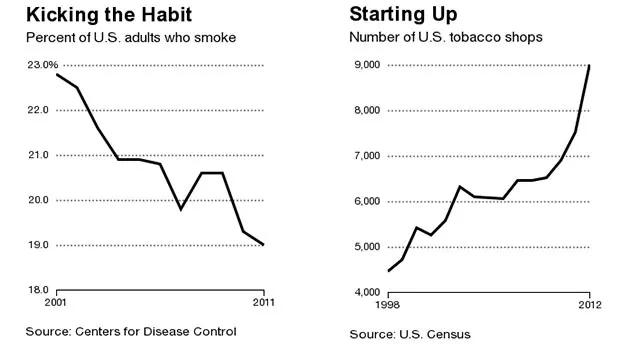 在美国,吸烟人数已经下降了几十年,但专门销售烟草的零售商却在蓬勃发展。根据人口普查数据,从1998年到2012年,美国的烟草店数量翻了一番,超过9,000家。