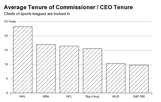 即使你采取最保守的框架,包括每位临时和短期专员,整体体育联盟的平均任期12.3年仍然显著超过企业首席执行官的任期。