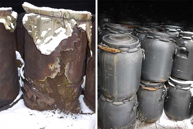2011年重新包装和安全处理前后的有毒MNCB桶摄影:Andrew McCartor