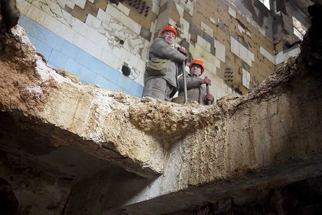 2013年参与TNT硝化建筑修复的工人摄影:安德鲁·麦卡托
