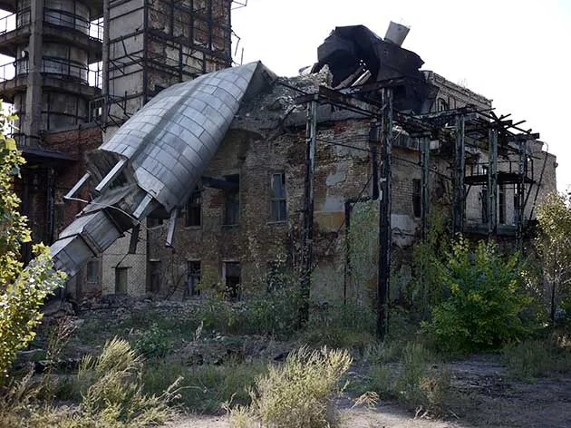 没有人愿意进入工厂建筑——其中一栋已经完全坍塌。Fuller召来了他最专业的助手Ira May,当时是美国陆军环境修复项目的负责人。几天后,他们返回现场进行检查。(由于仍有危险材料存在,工厂的位置、城市和市长的名字在此叙述中被隐去,同时也是为了保护市长的安全。今年夏天,亲俄分裂分子控制了该地区。)在进入旧工厂后不久,May看到一些撕裂的化学品袋子倾倒在一旁。他立即转身,命令所有人撤离。“就像是,‘我不想让任何人在这里,除非穿着完整的PPE [个人防护装备]白色防护服和呼吸设备,’”Fuller回忆道。“这里太有毒了。”