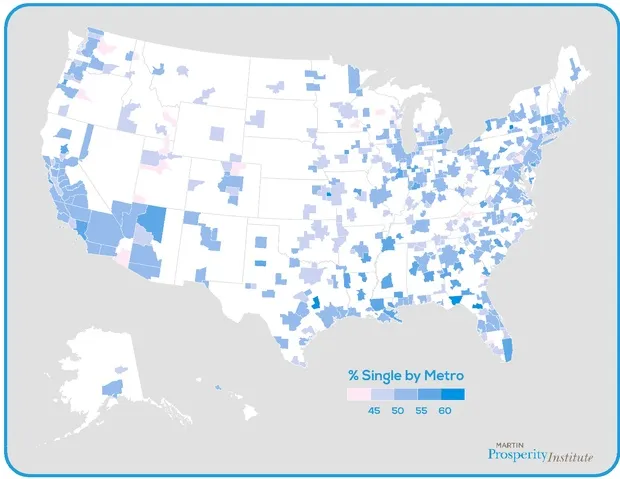 我的 马丁繁荣研究所 (MPI) 同事 夏洛塔·梅兰德 计算了 美国人口普查数据,关于单身、离婚或从未结婚的美国成年人比例。根据这些数据,去年美国有1.282亿单身人士,占总人口的51.2%。这些数据与彭博社报道的研究相似,该研究基于美国劳工统计局的数据,估计目前约有1.25亿16岁以上的美国人,或50.2%是单身。这一比例较1976年的37.6%有所上升。