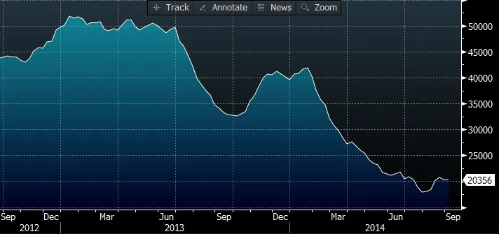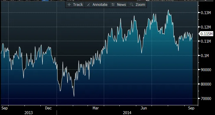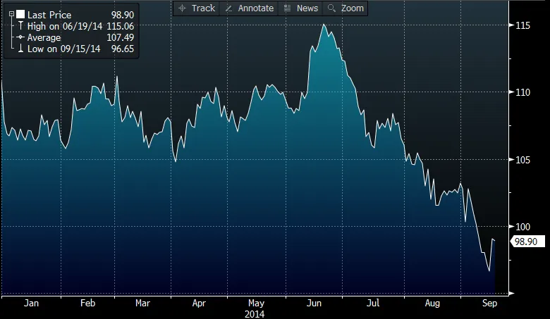 在过去的一周中,布伦特原油,即大西洋盆地原油的国际基准,交易价格低于每桶100美元。这使其重新进入正向市场。在期货市场上,2015年3月交付的石油价格为101美元。这与2009年发生的差异并不大,但足以导致储存需求的新一轮激增。截至9月中旬,浮动储存中的石油超过1.15亿桶,低于8月初的1.32亿桶——这比全世界每天生产的石油还要多。