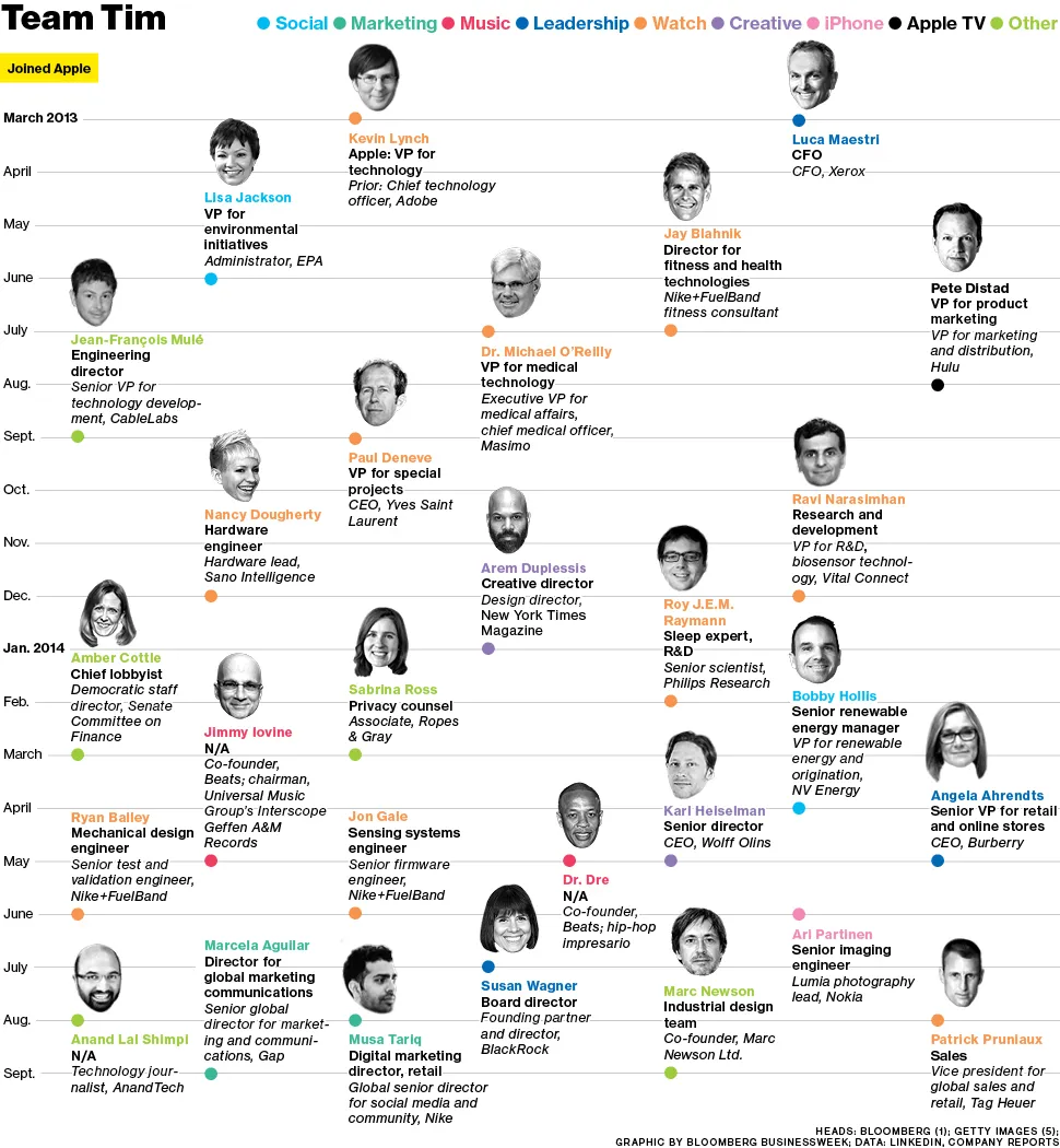 这次招聘热潮不仅仅是为了找到那些知道如何以高价销售手表的人,更是为了在公司内部增加多样化的观点。库克“非常专注于寻找各种各样的人,”苹果最大股东、资产管理公司黑石集团的创始合伙人兼董事苏珊·瓦格纳(Susan Wagner)说,她在今年夏天早些时候加入了公司的董事会。“这并不是你自动想到的多样性。它是关于引入经验、技能和视角。”