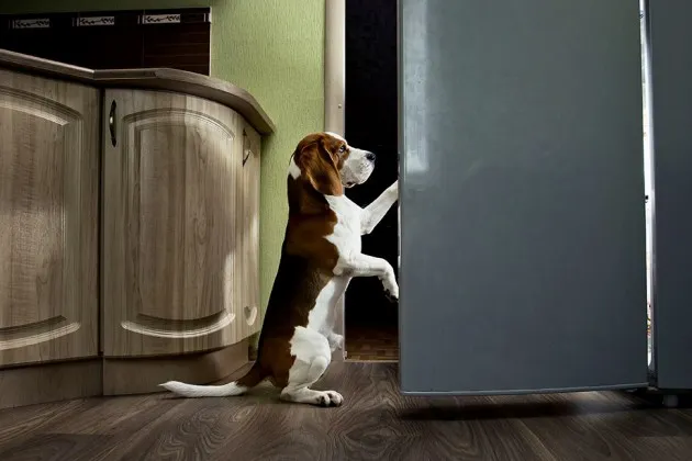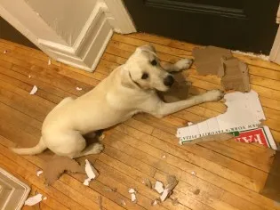 没有意大利香肠,没问题。作者的狗在品尝一个披萨盒。
