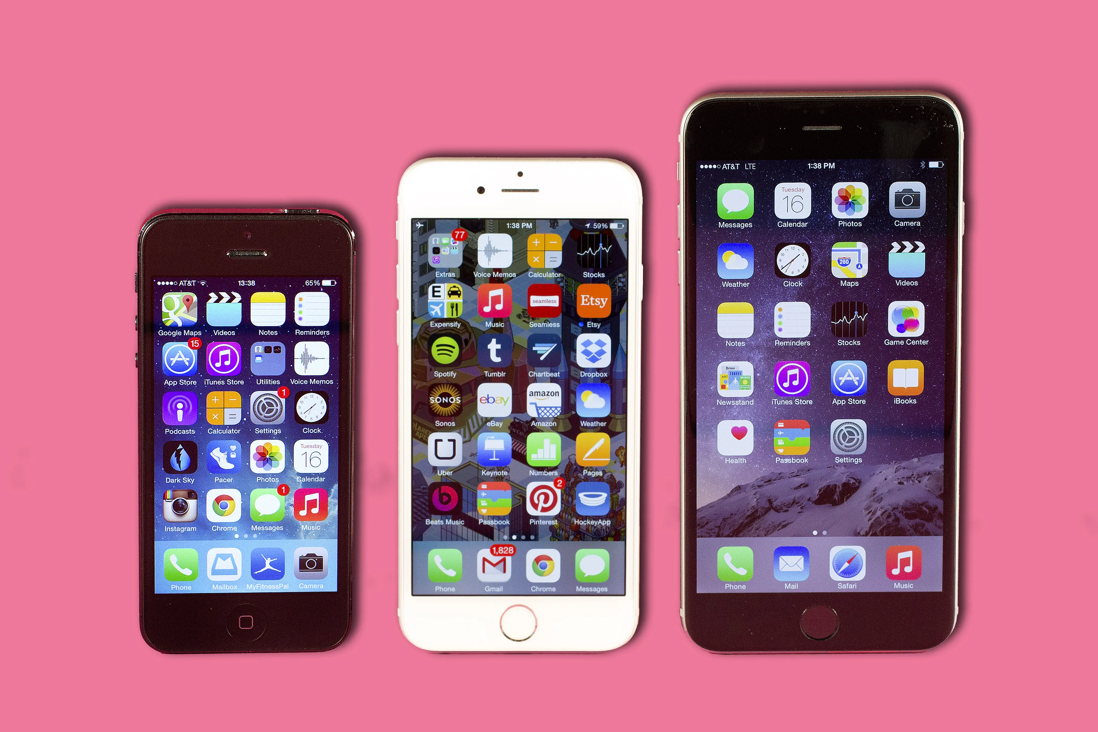 从左到右:iPhone 5、iPhone 6和iPhone 6 Plus