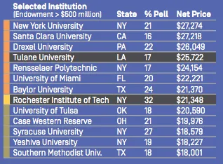 包括德雷克塞尔大学、杜兰大学和迈阿密大学在内的六所其他大学,为至少五分之一没有经济需求的学生提供援助。其他一些拥有超过5亿美元捐赠的私立大学向贫困学生收取超过60%的家庭收入,最显著的是纽约大学,该校要求家庭年收入低于30,000美元的学生支付27,274美元。