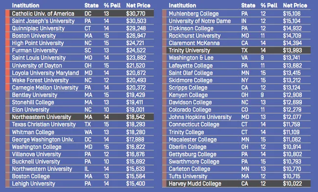 报告引用了贝勒大学的例子,称该校为了追求声望而向富裕学生提供折扣,而让贫困学生几乎没有经济支持。报告称,贝勒大学“没有经济需求”的三分之一新生平均获得学校提供的13,000美元的奖学金。与此同时,低收入学生向贝勒大学支付超过70%的家庭收入。自从采取这种方法以来,贝勒大学的平均SAT分数提高了,并在全国排名中上升。