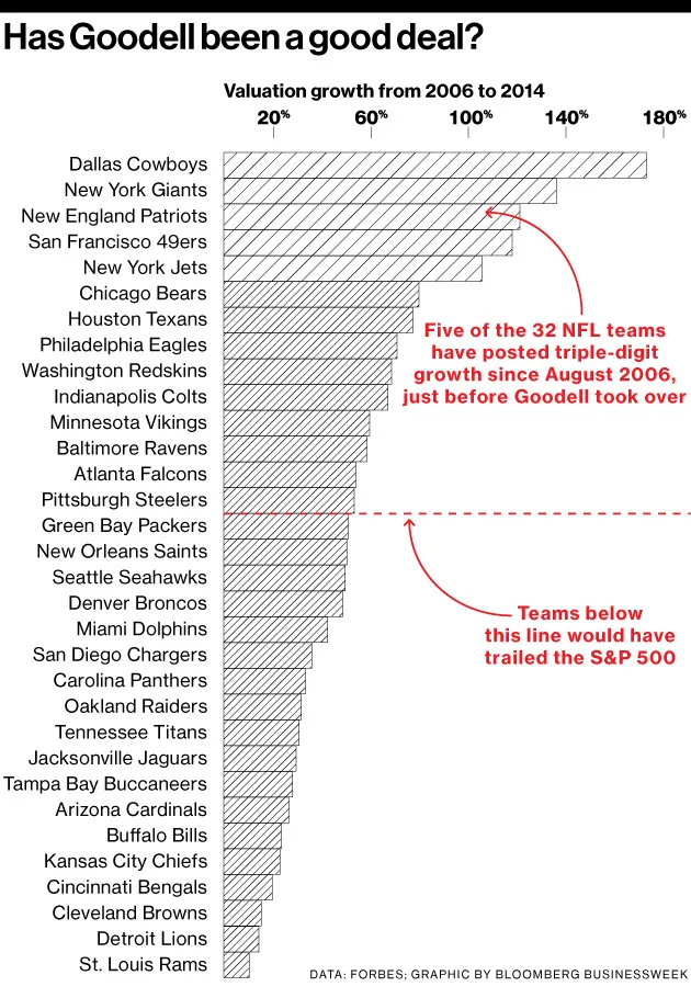 古德尔还证明了他愿意保护业主的利益,尽管公众反对声不断。去年,面对越来越多的科学证据将美式足球与退行性脑病联系在一起,古德尔与代表数千名前球员的律师达成了9.5亿美元的和解。该和解并未要求NFL承认任何责任。