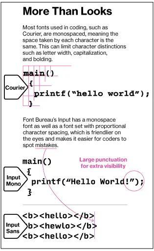 字体设计师如罗斯将他们的工作视为构建办公家具。Input,拥有168种风格(有五种不同的i和l),就像一把Aeron椅子:高科技、符合人体工程学且可定制。“我认为它应该是舒适的,”罗斯谈到他的最新作品时说。罗斯解释说,使用Input时,标点符号“像个 sore thumb 一样突出”,这样程序员可以发现错误。“如果你在Input中设置一本小说,标点符号会很分散注意力。但在代码中,这样的平衡更好,因为你不是在阅读,而是在扫描。”