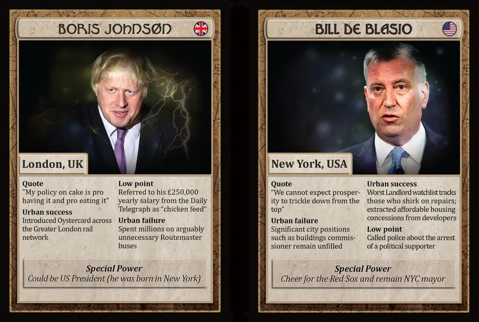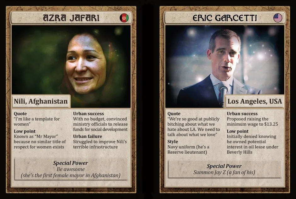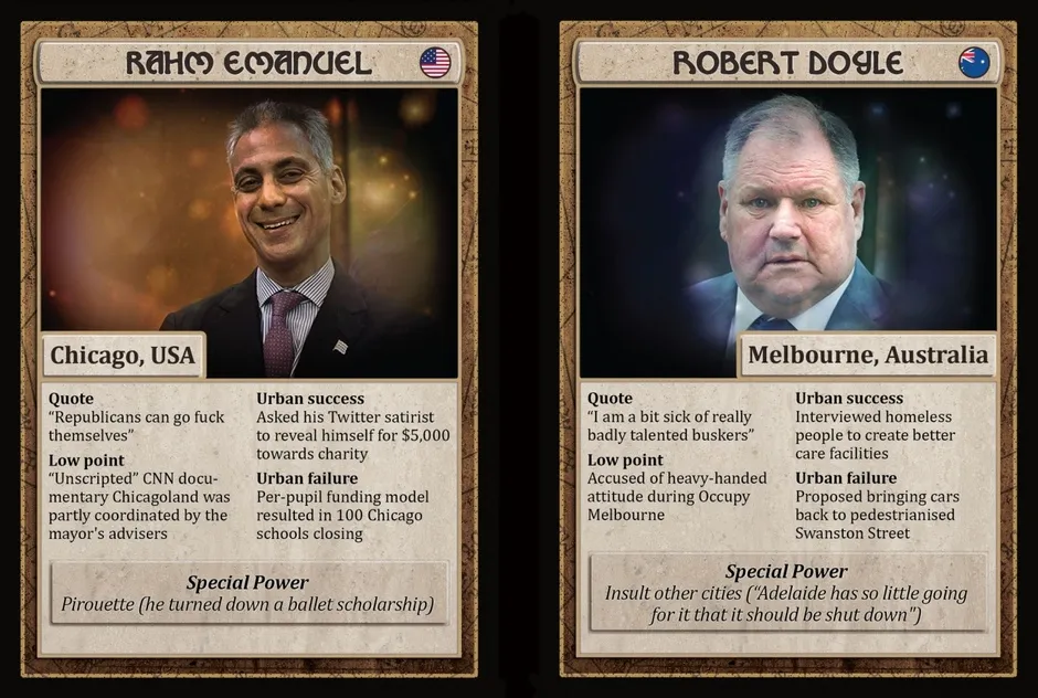由艺术家萨姆·谢尔顿和卫报的安娜·斯科特和克里斯·迈克尔模拟,市长档案类似于1993年流行的《魔法风云会》卡牌游戏中的生物卡,配有签名名言和特殊能力。不,这些并不是为了魔法收藏者:例如,这些卡牌并没有说明玩家必须消耗多少法力才能施放市长。(这很容易想象。两个沼泽法力加两个水法力就能得到新奥尔良市长米奇·兰德里。)
