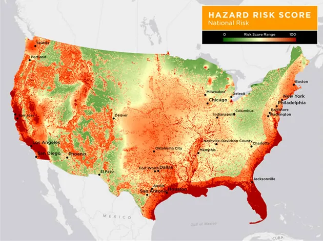 在计算这些风险时,事件的发生概率和事件的频率是影响因素之一,以及每种灾害对损害的贡献。佛罗里达州以94.51的最高分位居首位,定期面临飓风风、风暴潮、洪水、地陷以及——除了所有的水灾——野火的风险。路易斯安那州、加利福尼亚州和马萨诸塞州依次位列前五名,随后是堪萨斯州、康涅狄格州、俄克拉荷马州、南卡罗来纳州和特拉华州。