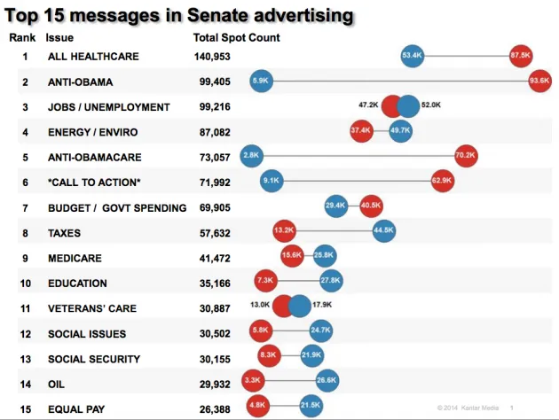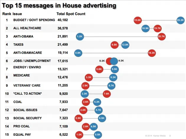 以下是参议院竞选中政治广告的前15个主题的细分: