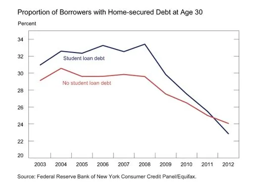 2013年4月纽约联邦储备银行的一份报告提供了一些答案,同时也提出了更多问题。2012年,背负学生贷款债务的人比没有债务的同龄人更不可能申请抵押贷款,这是至少十年来的第一次。