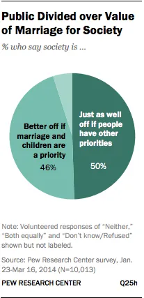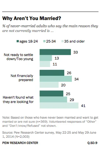 当皮尤询问人们为什么没有结婚时,最常见的回答是:a) 他们没有找到理想的人,b) 他们在经济上没有准备好(每个回答大约占总数的27%,并因年龄而异)。