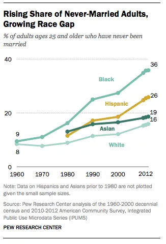 (需要记住的数据点:在未婚人群中,白人仍占51%,因为他们仍然是总体的多数。非裔美国人占美国成年人口的11%,在未婚人群中占四分之一——这就是他们被过度代表的原因。)