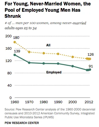 现在,将这一点与实际上有稳定工作的男性子集进行对比,就会发现问题所在。在此期间,每100名女性中有工作的男性数量从139下降到91。