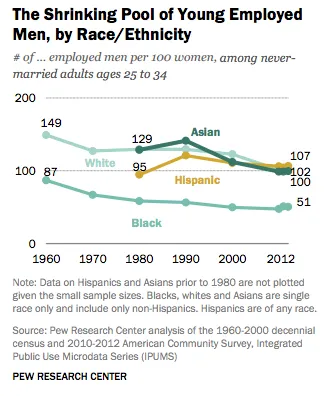 每100名女性中有工作的黑人男性数量远远少于其他种族——仅有51名。不仅如此,更多的黑人(77%)比白人(59%)更重视潜在配偶是否有工作。尽管大多数美国人倾向于说他们不一定想和同种族的人结婚,但现实是他们确实如此(美国85%的婚姻发生在同种族和同民族的人之间)。这似乎是导致非裔美国人未婚人数迅速上升的主要原因。