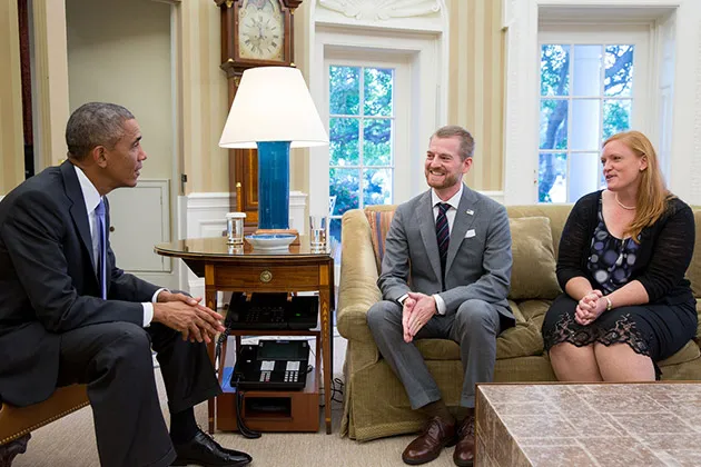 奥巴马总统于9月16日在椭圆形办公室会见肯特·布兰特利及其妻子安伯照片由皮特·苏扎/白宫提供
