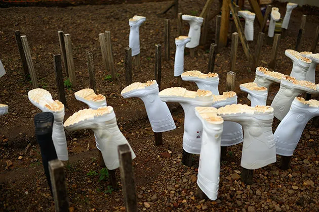 在塞拉利昂凯拉洪的无国界医生野战医院中,经过氯洗涤后的靴子在晾干摄影:塞缪尔·阿兰达