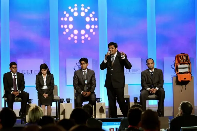 印度商学院的学生在2014年9月23日于纽约举行的第十届克林顿全球倡议年会上展示他们的商业计划,期间举行了Hult奖决赛和颁奖晚宴照片由Jonathan Fickies/AP Photo为Hult奖提供一组来自印度商学院的学生周二晚上离开时代广场的喜来登酒店,获得了100万美元,以帮助他们改善低收入社区的医疗保健获取,并获得了今年的Hult奖,该奖项由前美国总统比尔·克林顿每年颁发给一组学生社会企业家。