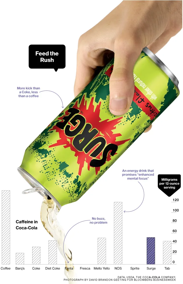可口可乐于1996年推出Surge,这是众多尝试与百事可乐的热门饮料Mountain Dew竞争中的一次。Mountain Dew是美国第四畅销的软饮料,近年来在消费者转向更健康、更自然的选择,如调味水和果汁时,成为百事可乐饮料系列中的一个罕见亮点。Mountain Dew在青少年、视频游戏玩家和极限运动爱好者中颇受欢迎,去年其销售表现超过了公司的整体软饮料销售,根据饮料文摘,一本行业出版物。尽管如此,2013年销量下降了2.2%,约为614百万箱。相比之下,可口可乐下降了0.5%,接近16亿箱,而百事可乐下降了3.6%,降至7.9亿箱。