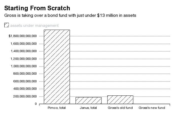 还有另一种:在太平洋投资管理公司,格罗斯负责公司的总回报基金,手中掌握着2220亿美元的资金。在贾纳斯,他将管理一笔小得多的资金,至少在开始时是这样。该公司的全球无约束债券基金截至上个月管理资产为 1290 万美元。