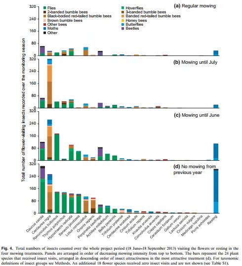 这些野花并没有什么特别之处。角果莲*,作为豌豆的一个常见亲属,以最高的速度从高草中冒出。接下来是沙葱,一种在英国原生的野生胡萝卜科植物。接着是黑蓟——*一种常被视为杂草的普通雏菊——它吸引了比其他植物更多的蜜蜂种类,如图四所示。尽管它们很普通,这些花仍然为吸引重要的昆虫做出了很多贡献。